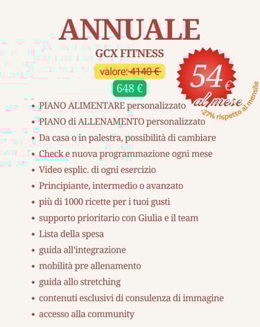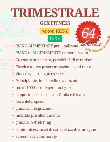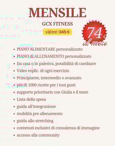 Piano alimentare completamente personalizzato su misura per TE e per i TUOI obiettivi, studiato in base al tuo punto di partenza, la tua disponibilità, gusti e stile di vita che verrà aggiornato ogni mese in base ai tuoi progressi.