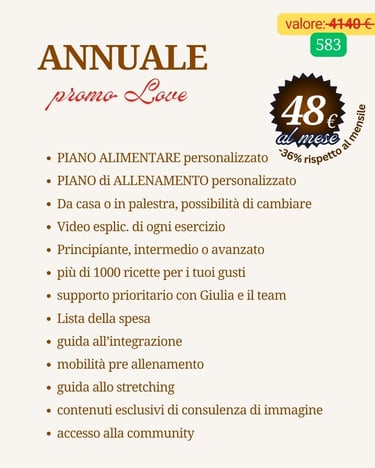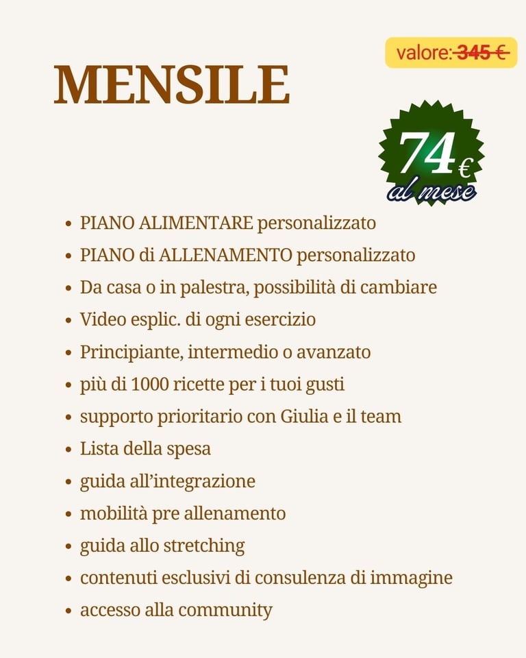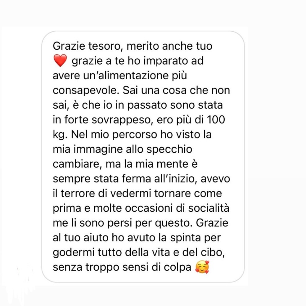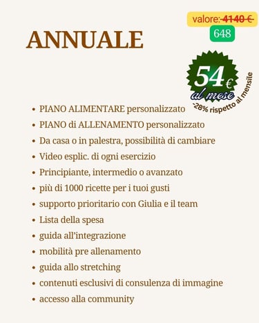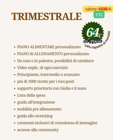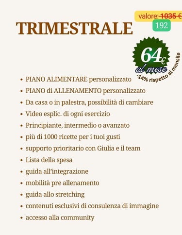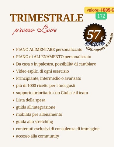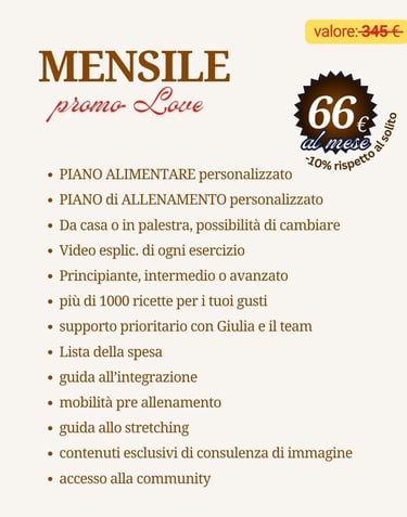 Piano alimentare completamente personalizzato su misura per TE e per i TUOI obiettivi, studiato in base al tuo punto di partenza, la tua disponibilità, gusti e stile di vita che verrà aggiornato ogni mese in base ai tuoi progressi.