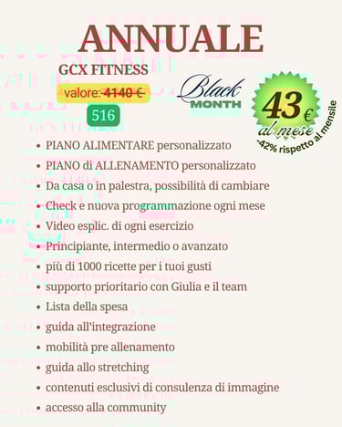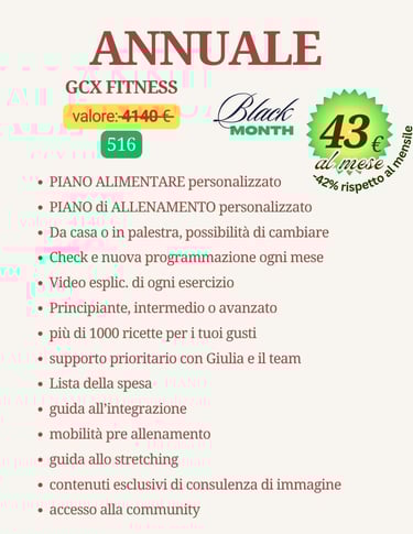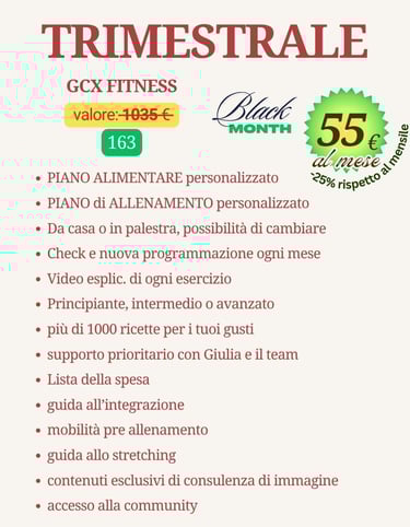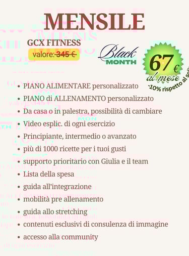 Piano alimentare completamente personalizzato su misura per TE e per i TUOI obiettivi, studiato in base al tuo punto di partenza, la tua disponibilità, gusti e stile di vita che verrà aggiornato ogni mese in base ai tuoi progressi.