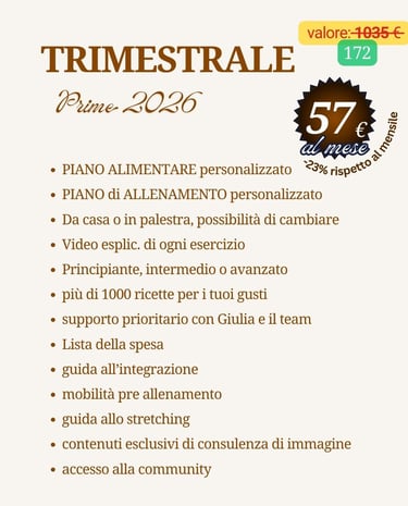 Piano alimentare completamente personalizzato su misura per TE e per i TUOI obiettivi, studiato in base al tuo punto di partenza, la tua disponibilità, gusti e stile di vita che verrà aggiornato ogni mese in base ai tuoi progressi.